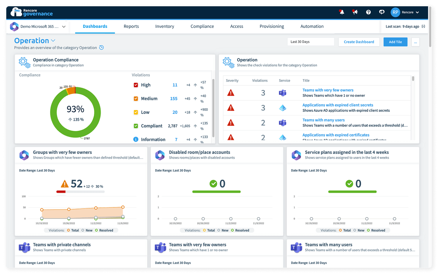 Die Verwaltung von Microsoft Teams Governance über die nativen Tools von Microsoft bedeutet oft, dass man mit mehreren Dashboards und komplexen Konfigurationen jonglieren muss. Rencore Governance beseitigt diese Komplexität. Es bietet eine einheitliche, speziell entwickelte Plattform für Microsoft 365 und Teams, die Ihnen hilft: